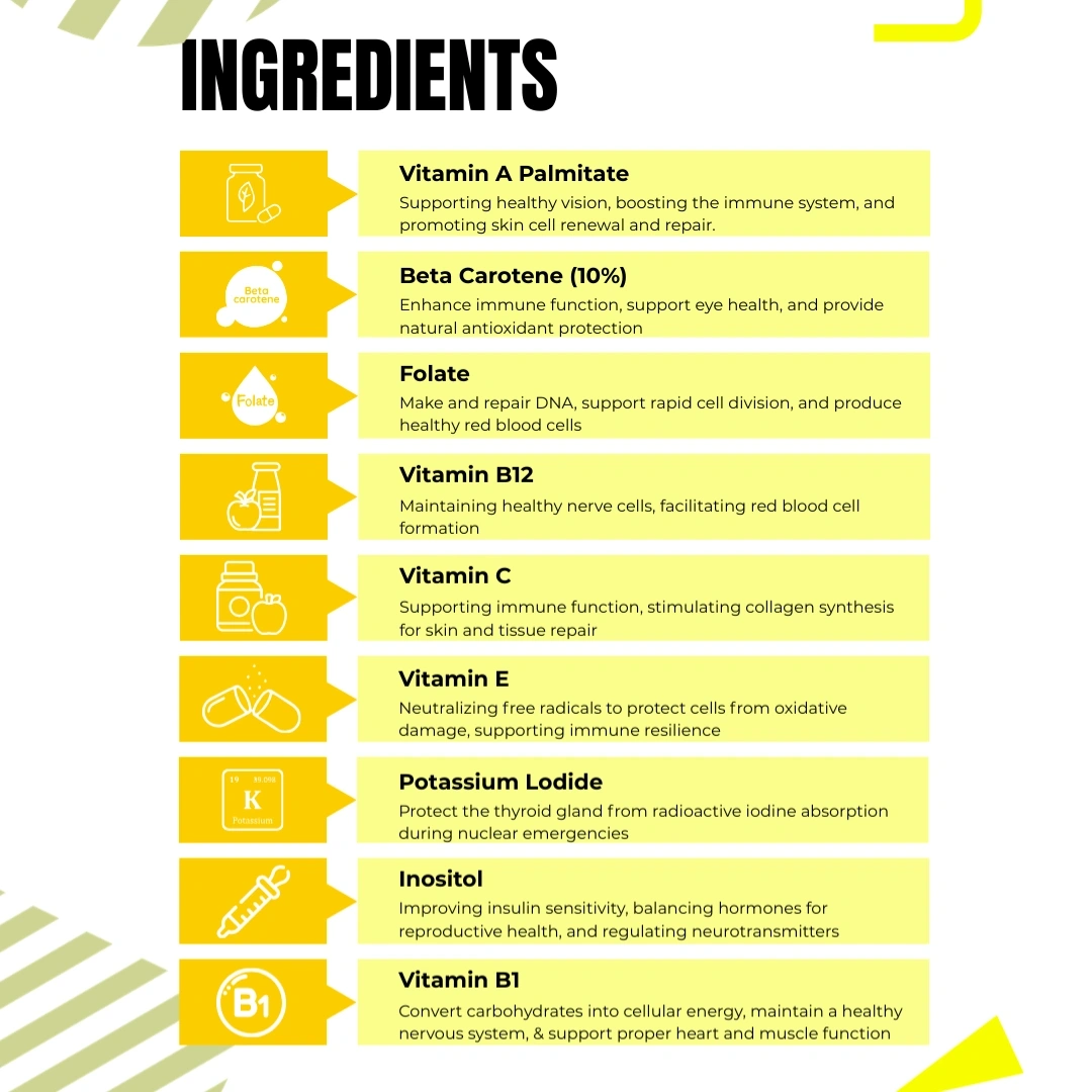 B-Vitamin Complex (B1, B2, B5, B6, B12, Niacinamide, Biotin): Converts food into energy and supports a healthy nervous system.