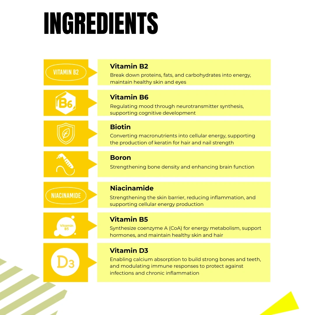 Vitamin D3 & Boron: To build strong bones and healthy teeth.